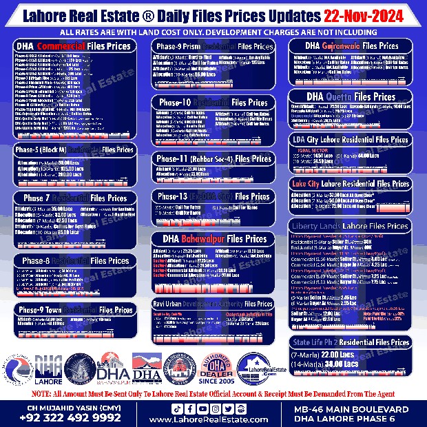 Stay updated with the most recent file rates for November 22, 2024. Explore detailed insights into commercial and residential file prices across various DHA phases in Lahore, Multan, Gujranwala, Quetta & many other well-known societies.