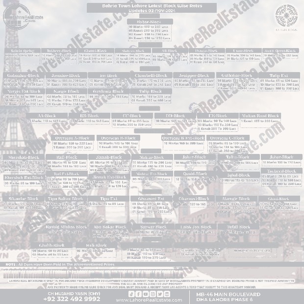 Bahria Town Lahore Plot Prices Blockwise Rates November 04, 2024