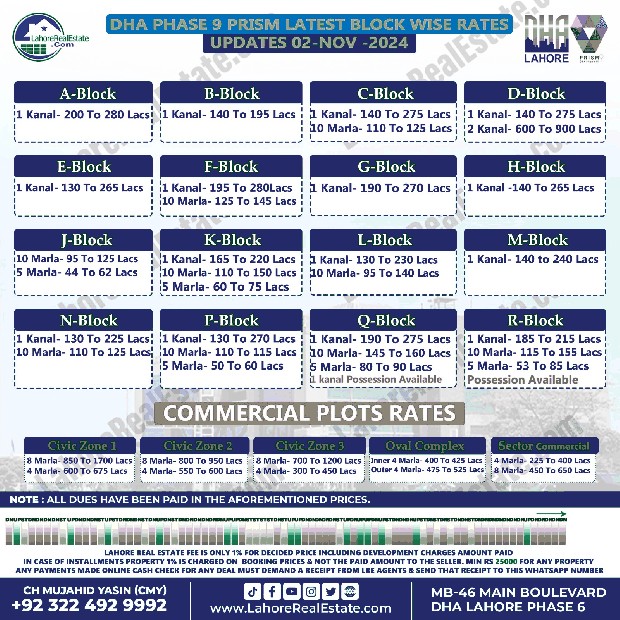 DHA Lahore Phase 9 Prism Plot Prices Blockwise Rates November 04, 2024