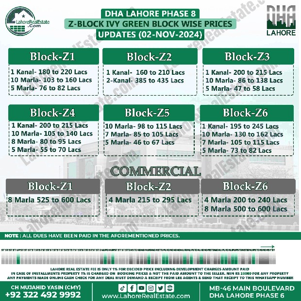 DHA Lahore Phase-8 IVY Green Plot Prices Blockwise Rates November 04, 2024