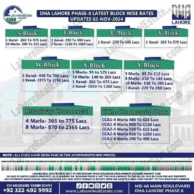 DHA Lahore Phase-8 Plot Prices Blockwise Rates November 04, 2024
