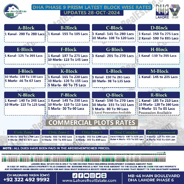 DHA Lahore Phase 9 Prism Plot Prices Blockwise Rates Oct 28, 2024