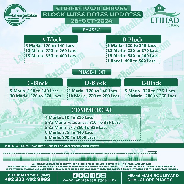 Etihad Town Lahore Plot Prices Blockwise Rates Oct 28, 2024