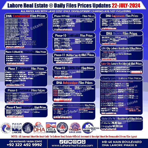 Disclaimer: This update reflects the current market status as of July 29, 2024. File rates can fluctuate. We recommend consulting with Lahore Real Estate ® for the most recent information and expert guidance tailored to your specific investment goals.