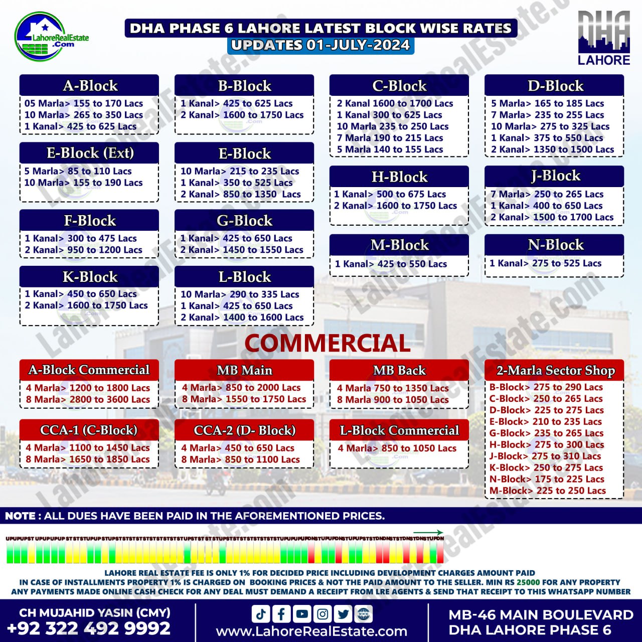 DHA Lahore Phase 6 Plot Prices Blockwise Rates July 03, 2024