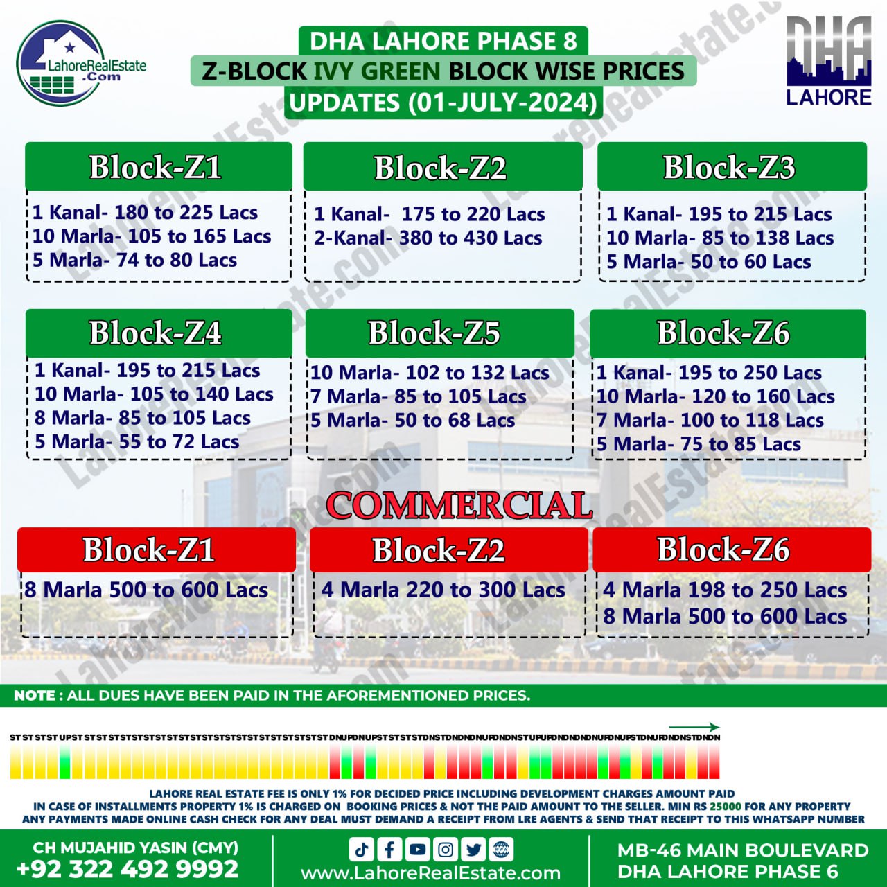 DHA Lahore Phase 8 IVY Green Plot Prices Blockwise Rates July 03, 2024