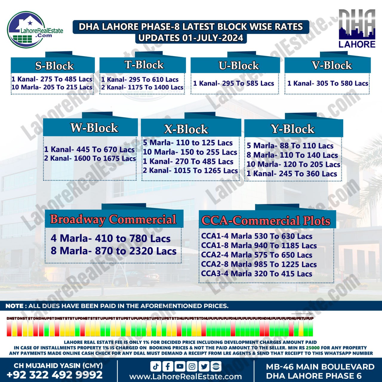DHA Lahore Phase 8 Plot Prices Blockwise Rates July 03, 2024