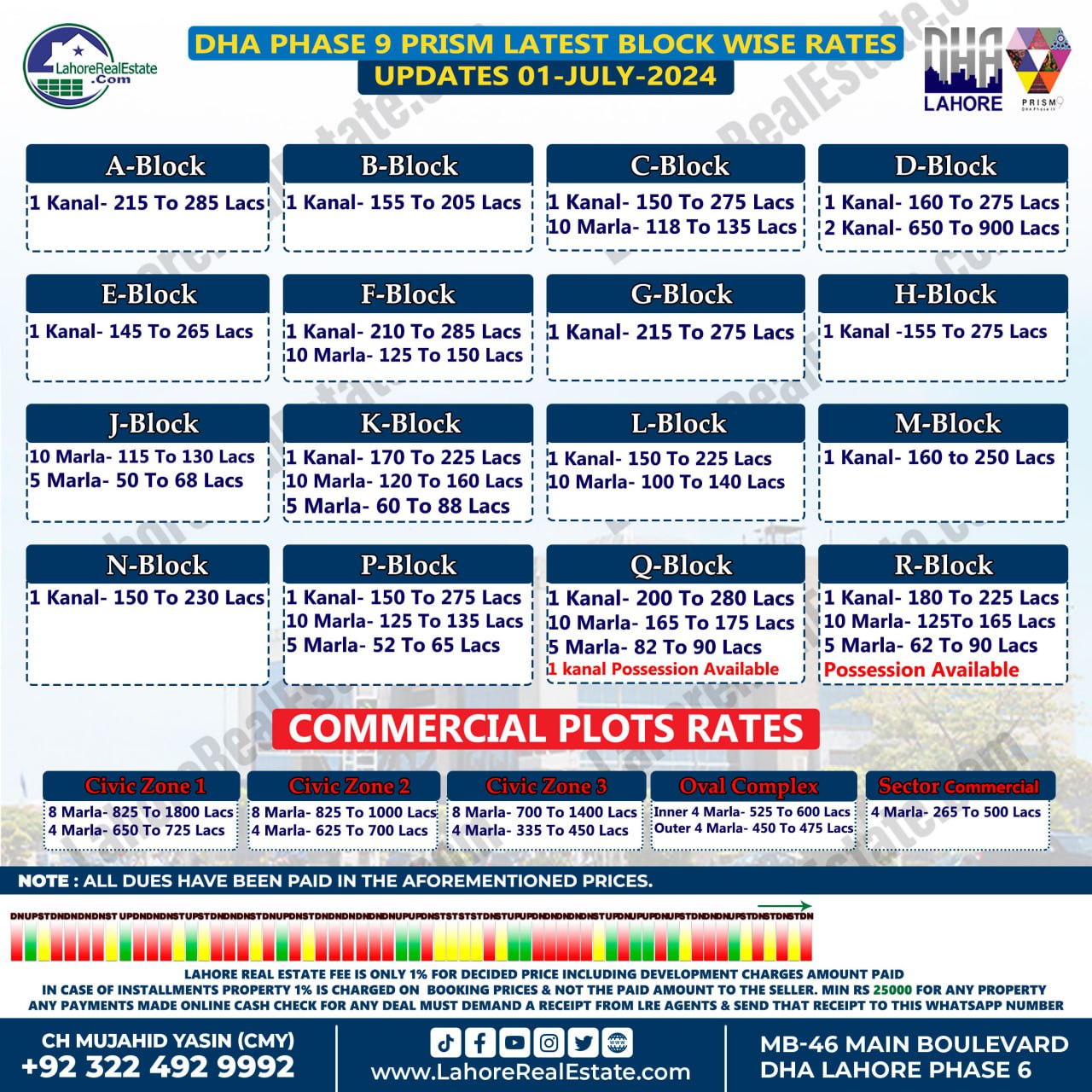 DHA Lahore Phase 9 Prism Plot Prices Blockwise Rates July 03, 2024