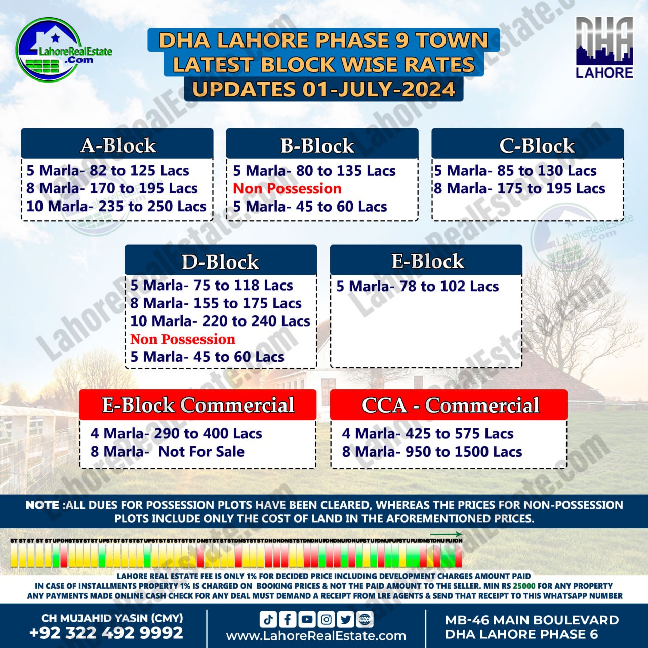DHA Lahore Phase 9 Town Plot Prices Blockwise Rates July 03, 2024