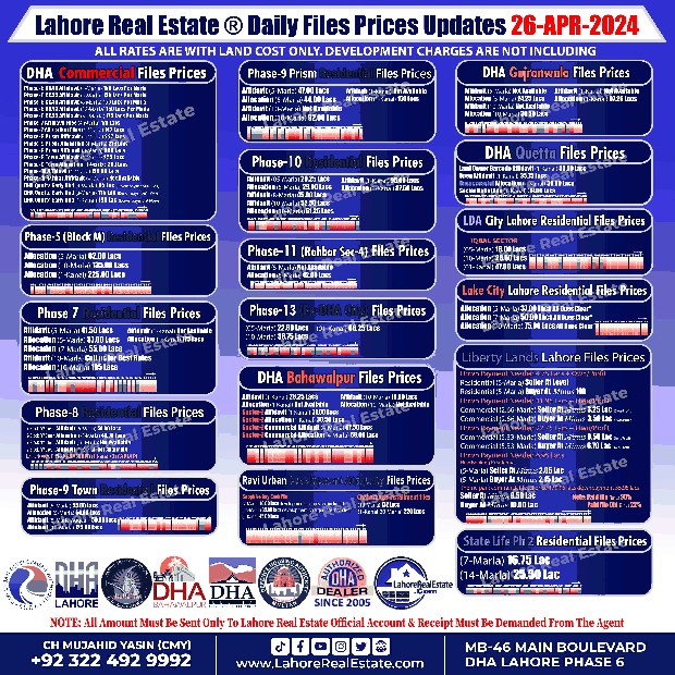 Empowered by expert insights and the most up-to-date file rates (as of April 25, 2024), navigate the real estate market with confidence. Make informed investment choices and unlock lucrative opportunities in DHA, LDA City, Liberty Lands, and more!