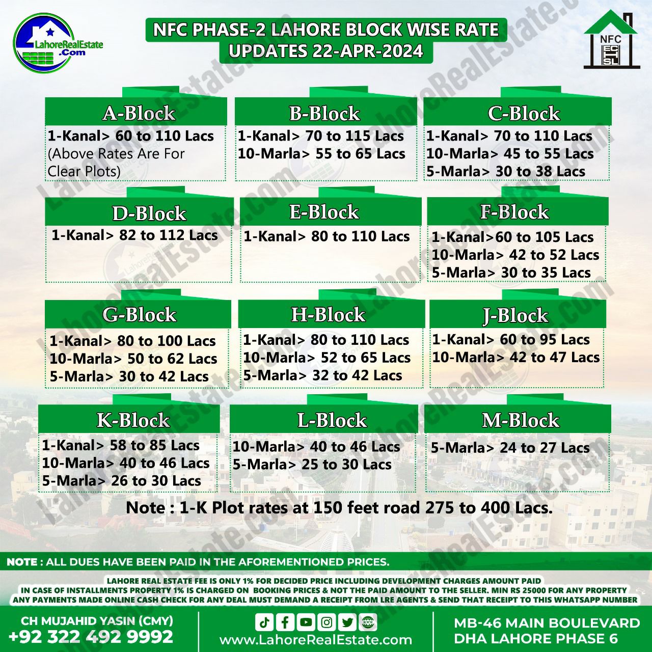 NFC Phase 2 Housing Scheme Lahore Plot Prices Blockwise Rates 22nd April 2024