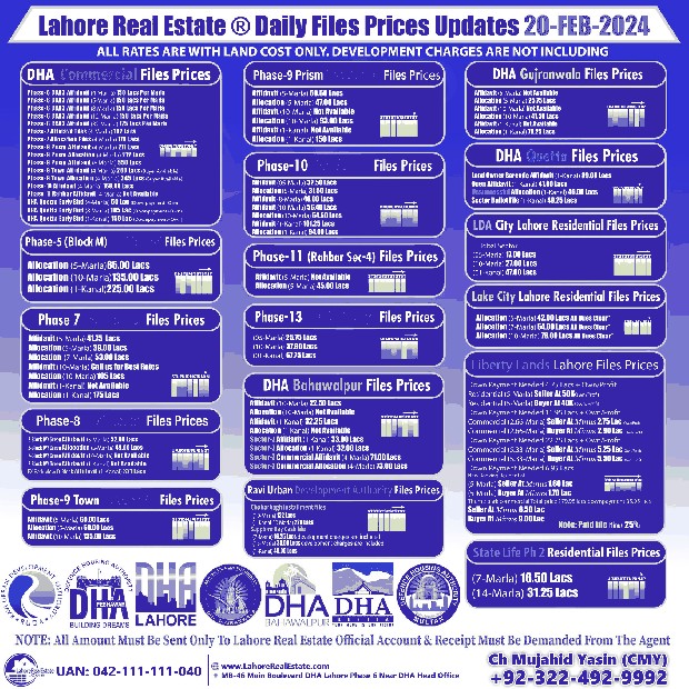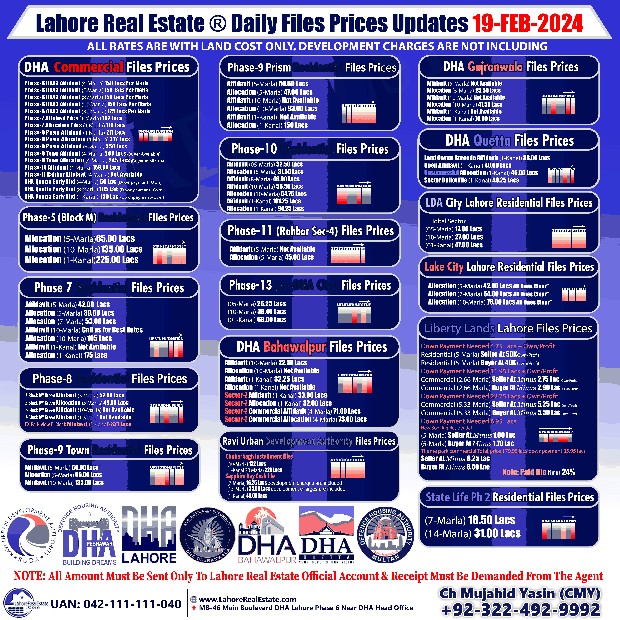 Lahore Real Estate® brings you the latest insights into the dynamic property market. Stay informed with current residential and commercial file rates for top developments like DHA (all phases), State Life, LDA City, Lake City, Liberty Lands, RUDA Sapphire Bay Zone-3, and more. Connect with our expert team, Ch Mujahid Yasin (CMY) and Adil Saeed, for personalized investment guidance and navigate your journey with confidence.
