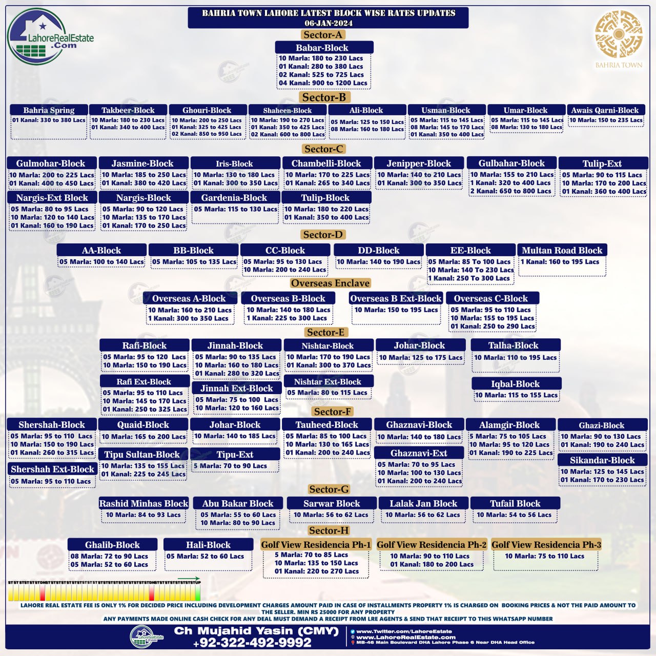 Bahria Town Lahore Plot Prices Blockwise Rates 8th January 2024