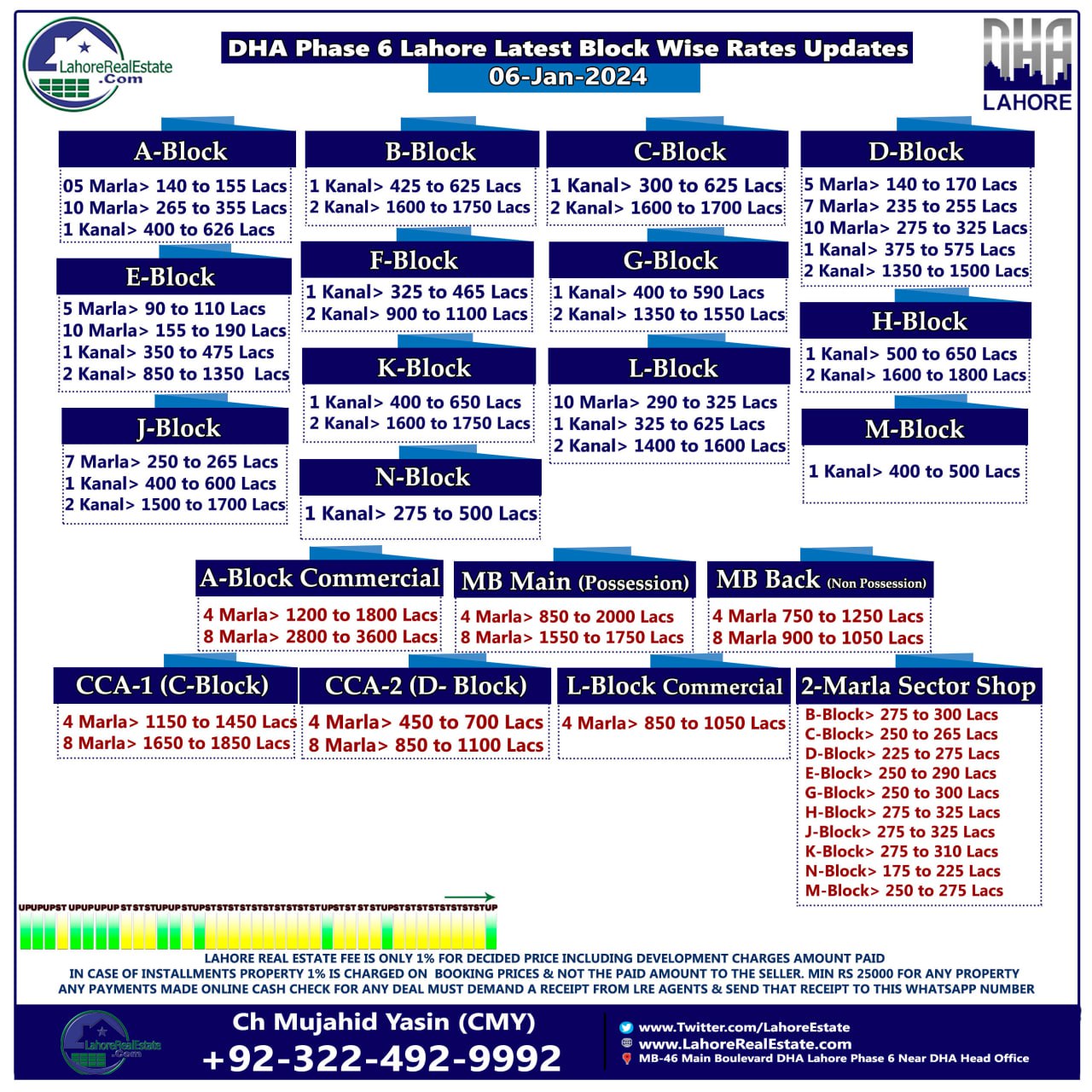 DHA Lahore Phase 6 Plot Prices Blockwise Rates 8th January 2024