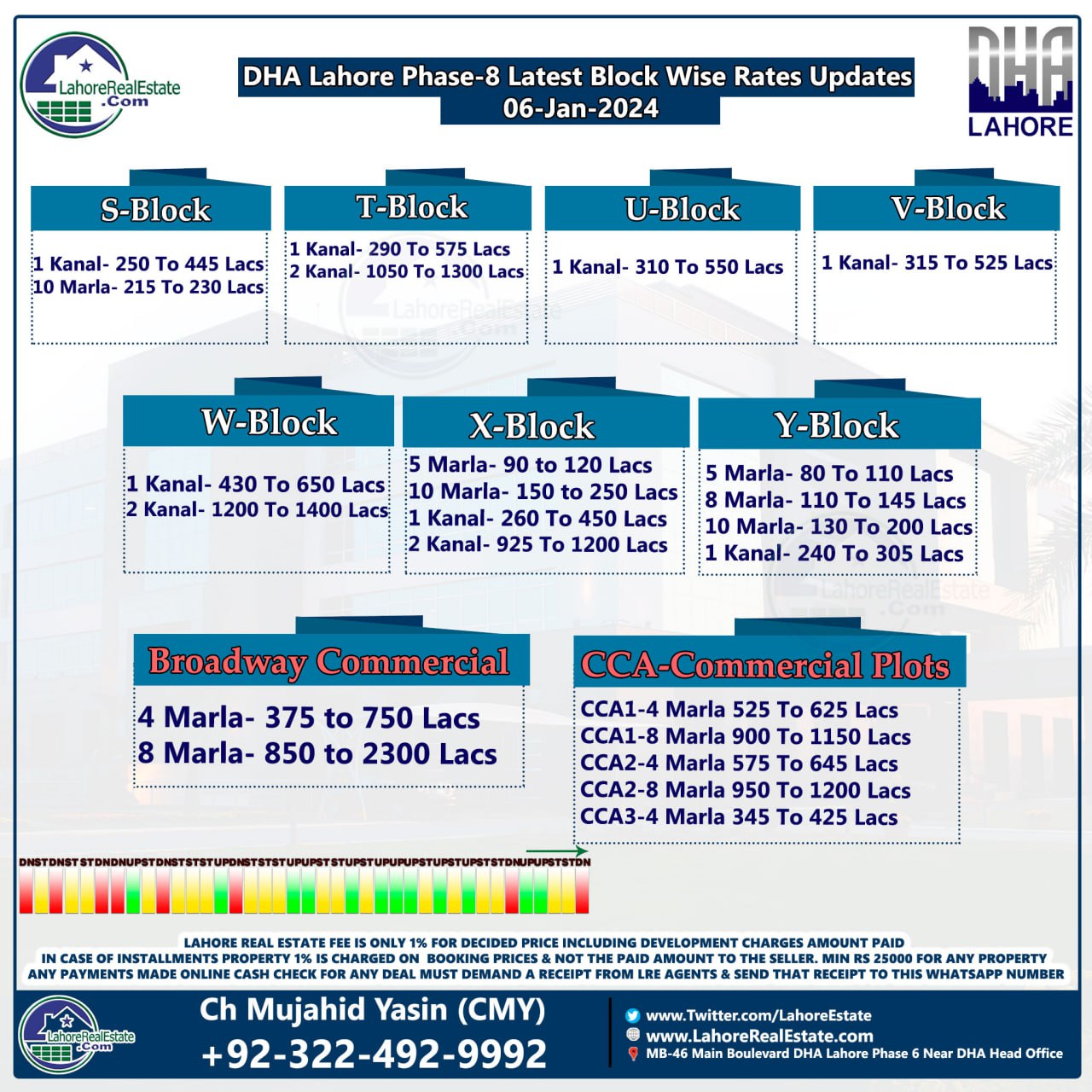 DHA Lahore Phase 8 Plot Prices Blockwise Rates 8th January 2024