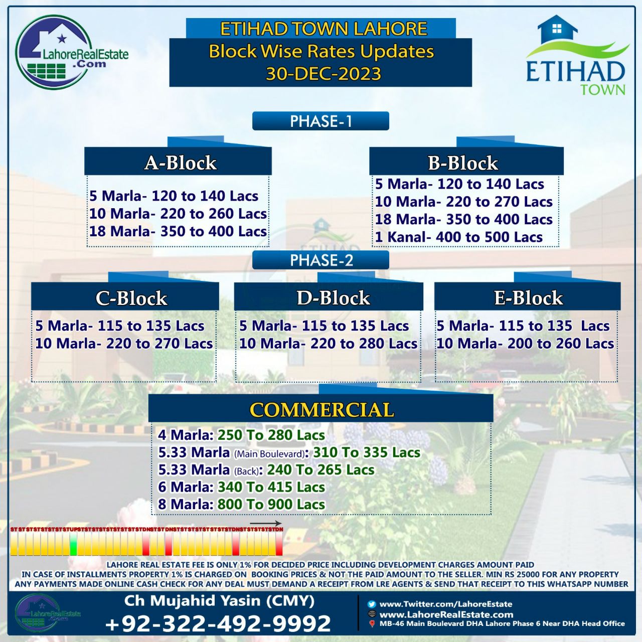 Etihad Town Lahore Plot Prices Blockwise Rates 1st January 2024