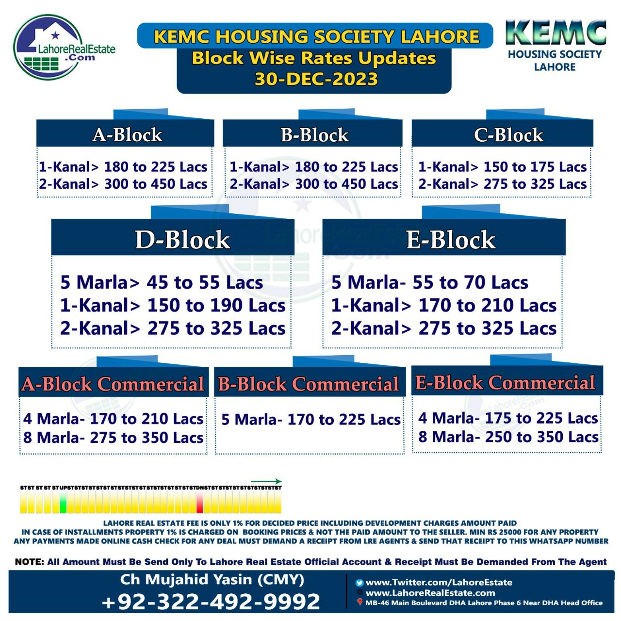 KEMC Lahore Plot Prices Blockwise Rates by Lahore Real Estate 1st January 2024