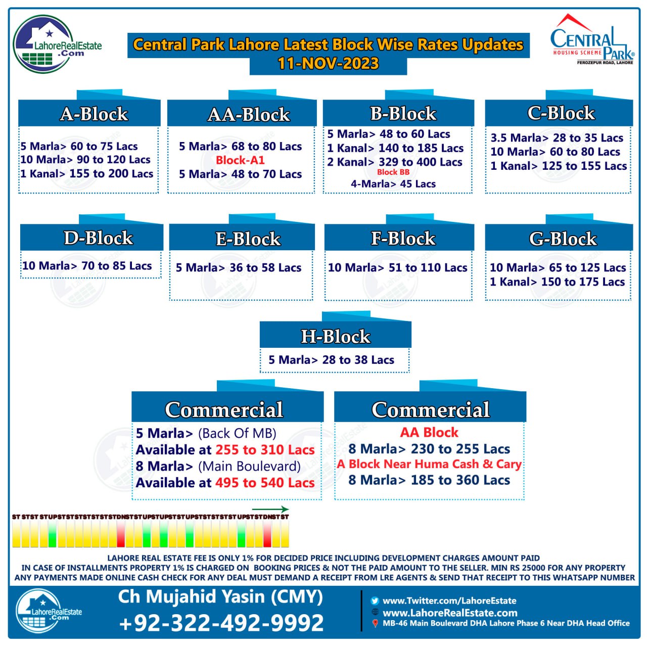 Central Park Lahore Plot Prices Blockwise Rates 13 November 2023