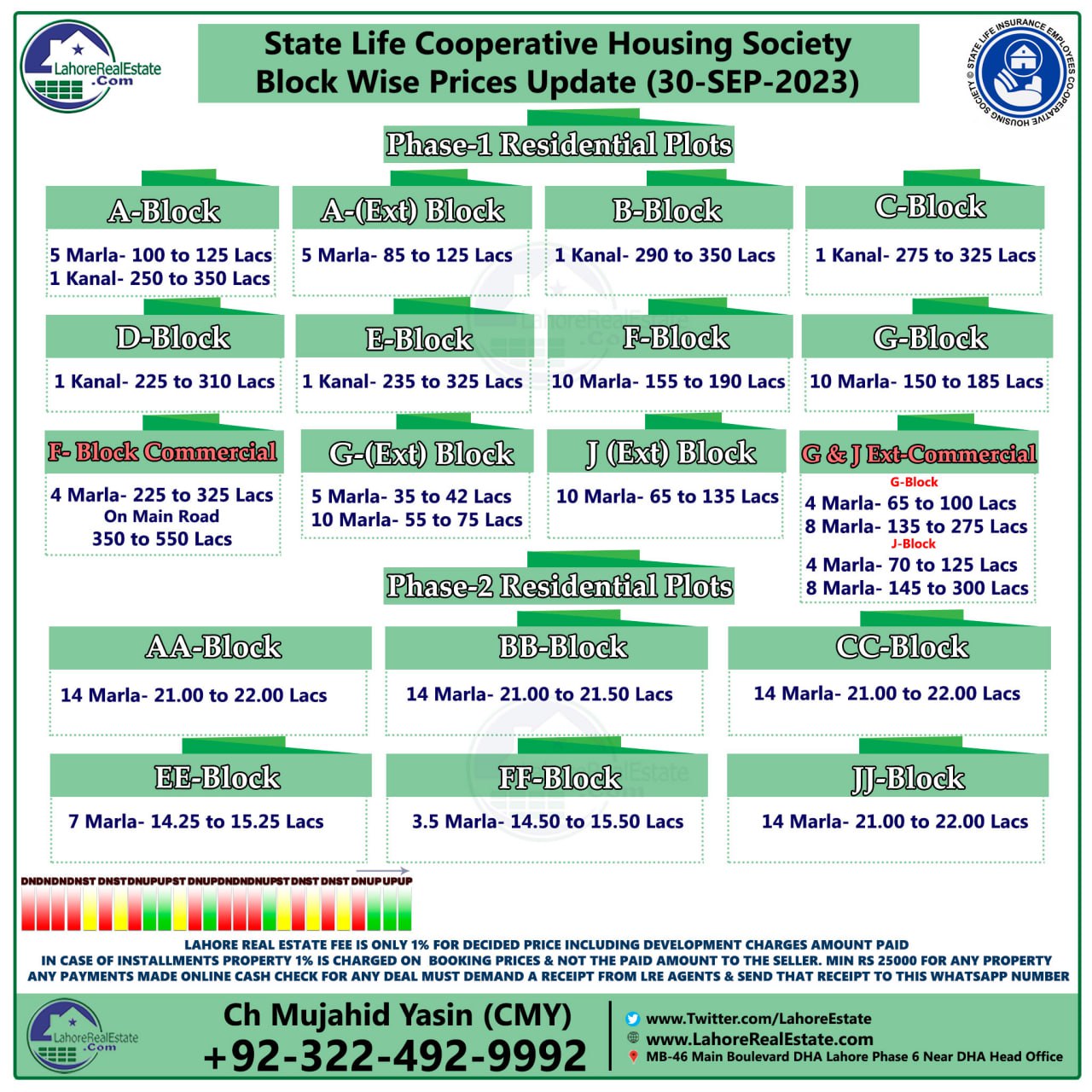 State Life Housing Scheme Lahore Plot Prices Blockwise Rates 30th September 2023