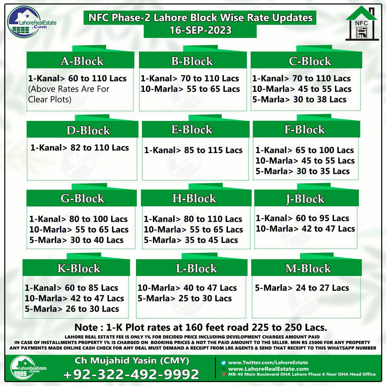 NFC Phase 2 Housing Scheme Lahore Plot Prices Blockwise Rates 18th September 2023
