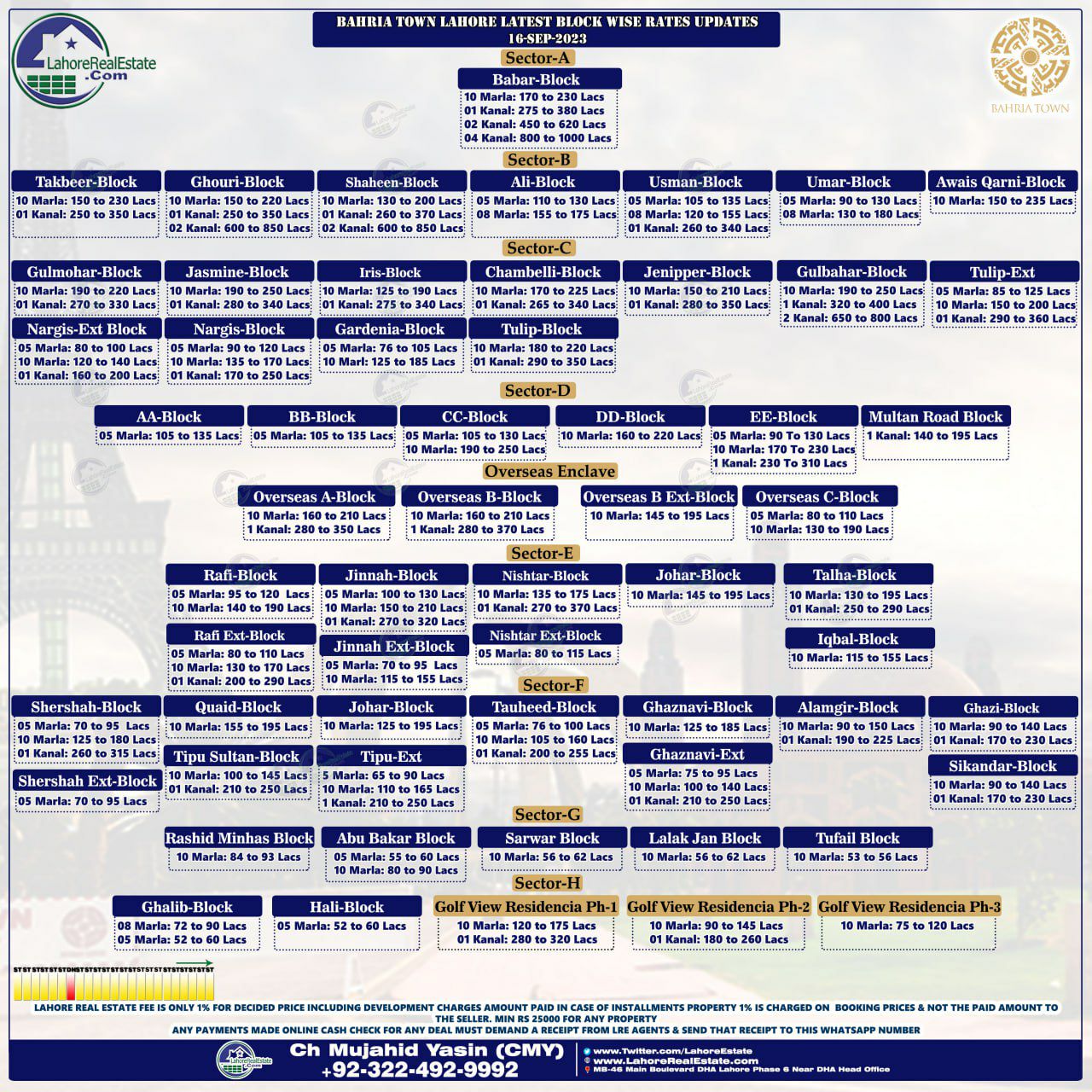 Bahria Town Lahore Plot Prices Blockwise Rates 18th September 2023
