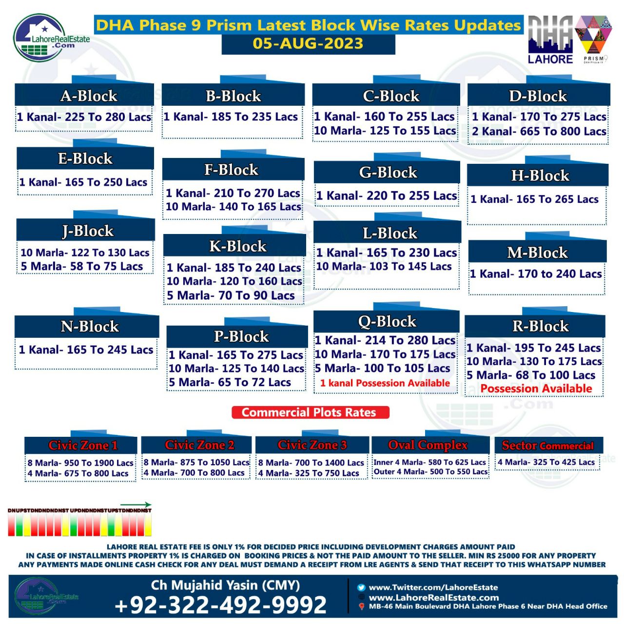 DHA Lahore Phase 9 Prism Plot Prices Blockwise Rates 8th August 2023