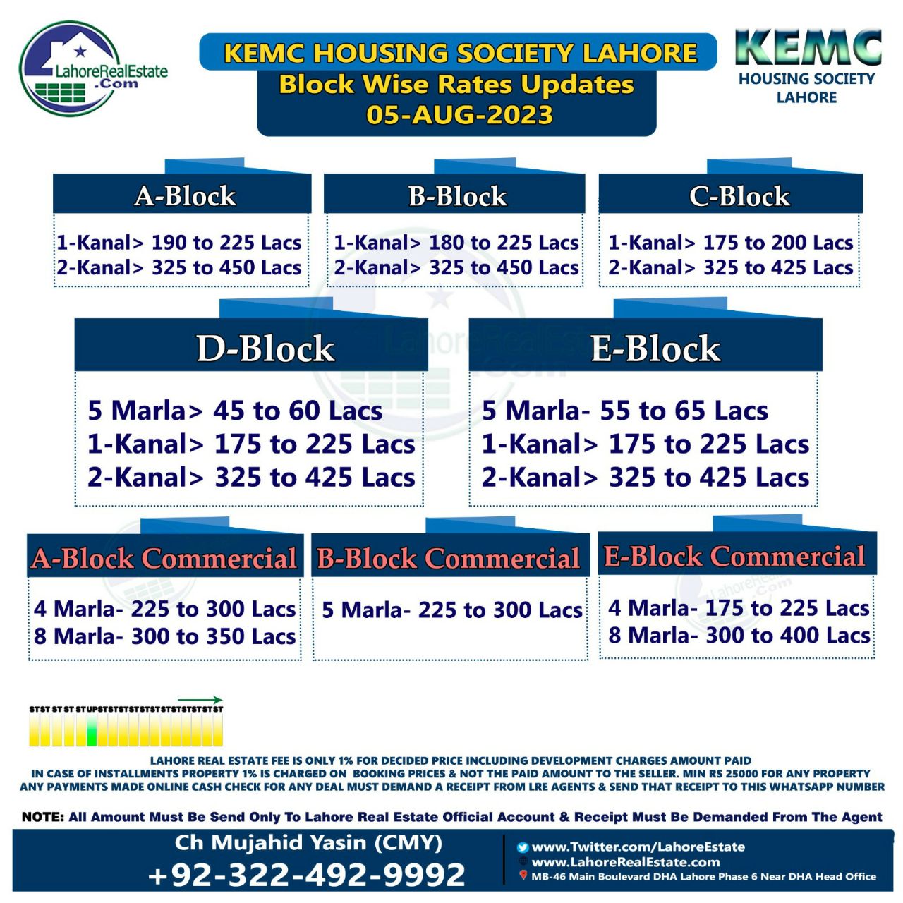 KEMC Lahore Plot Prices Blockwise Rates 8th August 2023