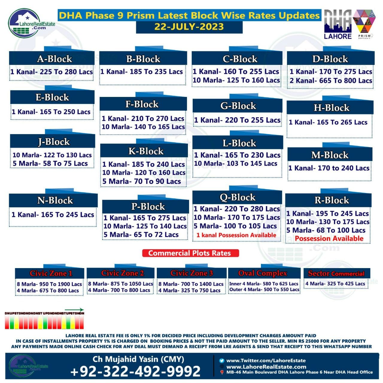 DHA Lahore Phase 9 Prism Plot Prices Blockwise Rates 25th July 2023