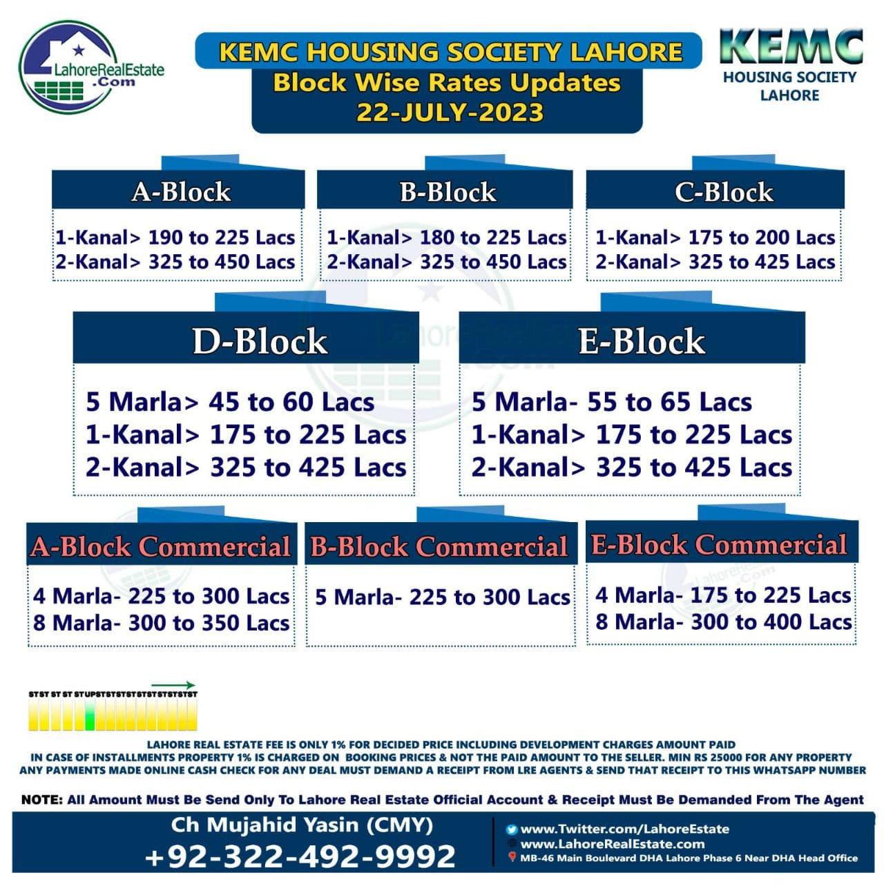 KEMC Lahore Plot Prices Blockwise Rates 25th July 2023