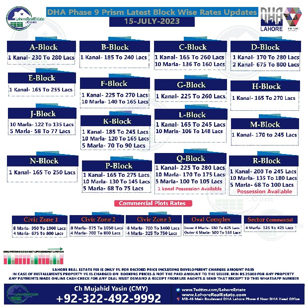 DHA Lahore Phase 9 Prism Plot Prices Blockwise Rates 17th July 2023