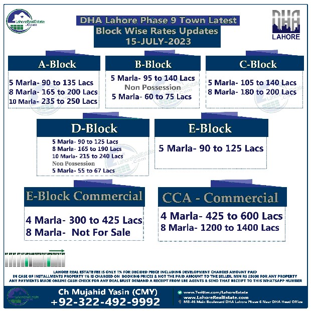 DHA Lahore Phase 9 Town Plot Prices Blockwise Rates 17th July 2023