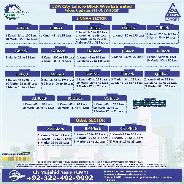 LDA City Lahore Plot Prices Blockwise Rates 17th July 2023