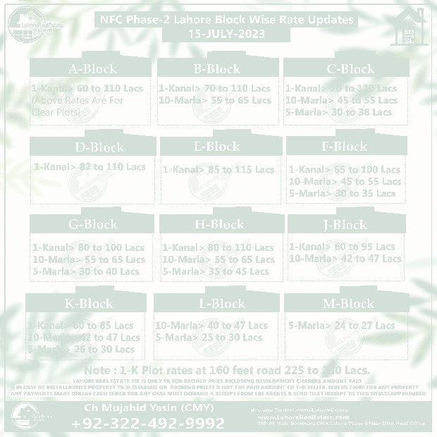 NFC Phase 2 Housing Scheme Lahore Plot Prices Blockwise Rates 17th July 2023