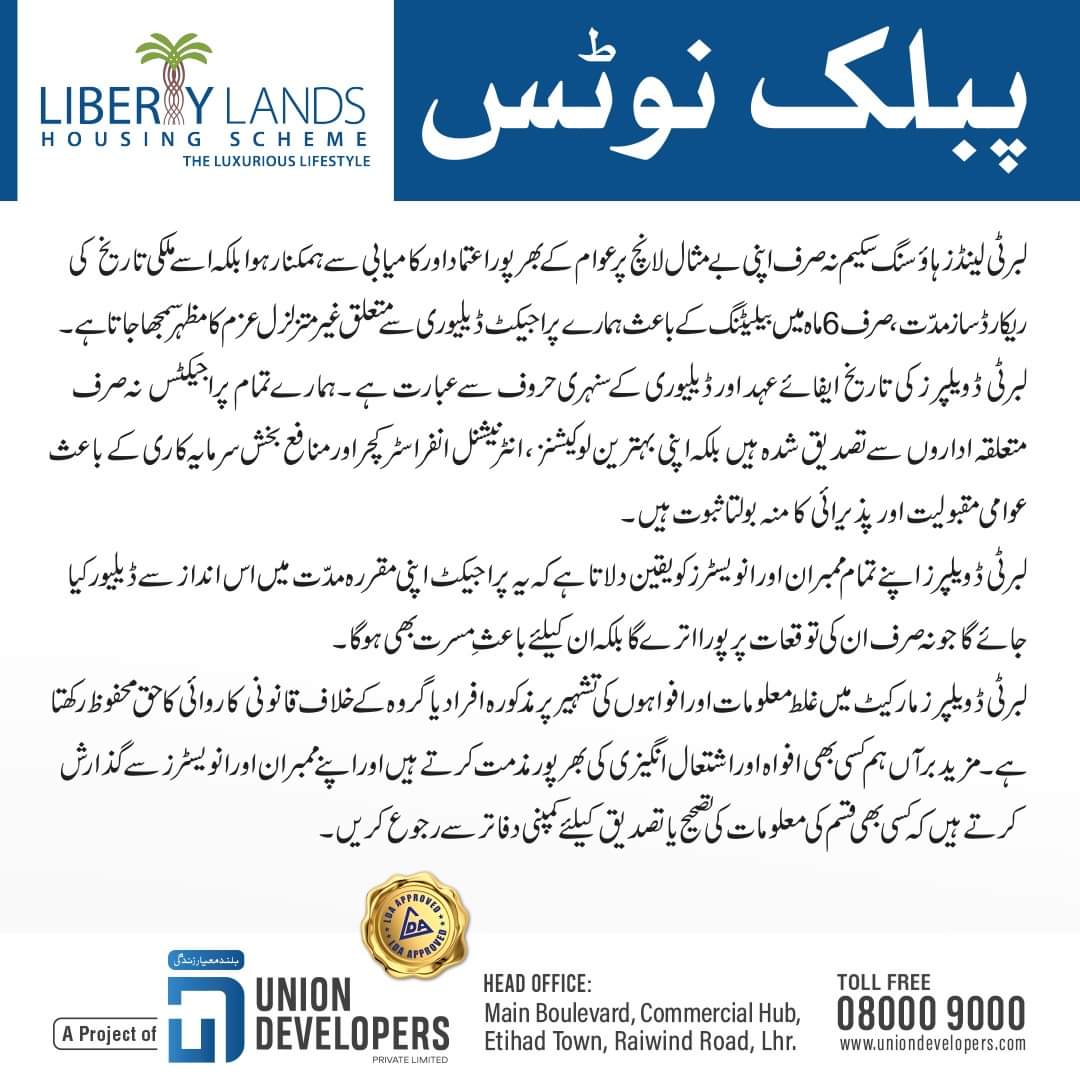 Liberty Lands Lahore New Booking Price 37.75 Lacs 5 Marla Residential Down Payment 6.95 Lacs (Seller at -1.00 Lacs | Buyer at -1.10 Lacs)