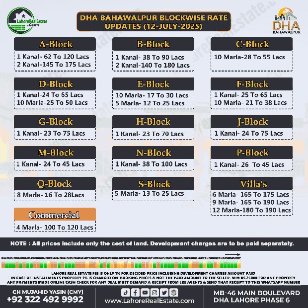 DHA Bahawalpur Plot Prices Blockwise Rates July 15, 2025