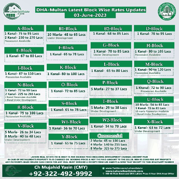 DHA Multan Plot Prices Blockwise Rates 05 June 2023