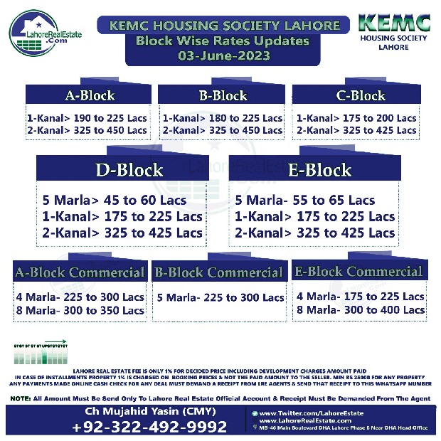 KEMC Lahore Plot Prices Blockwise Rates 05 June 2023