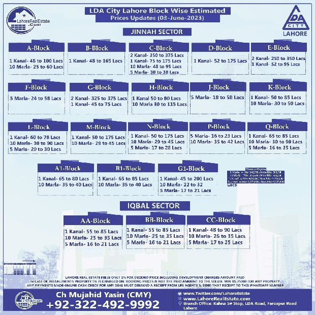 LDA City Lahore Plot Prices Blockwise Rates 05 June 2023