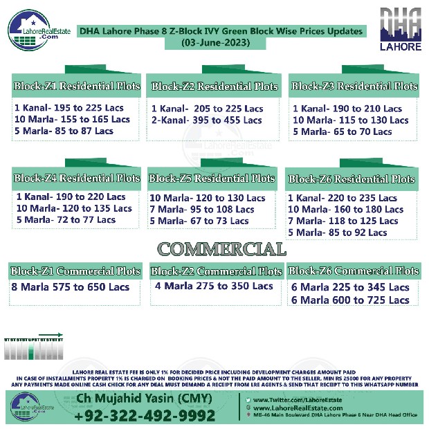 DHA Phase 8 IVY Green Lahore Plot Prices Blockwise Rates 5th June 2023
