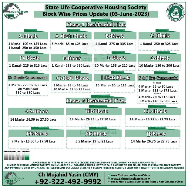State Life Housing Society Lahore Plot Prices Blockwise Rates 05 June 2023