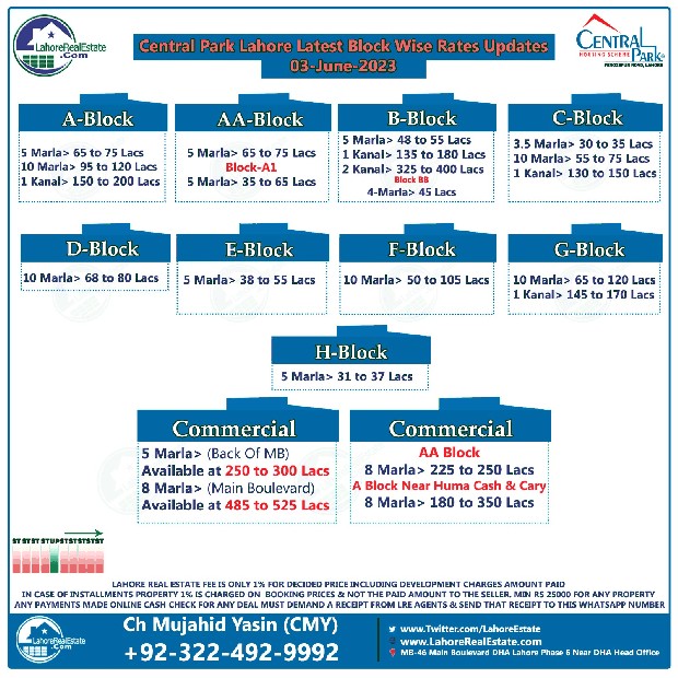 Central Park Lahore Plot Prices Blockwise Rates 05 June 2023