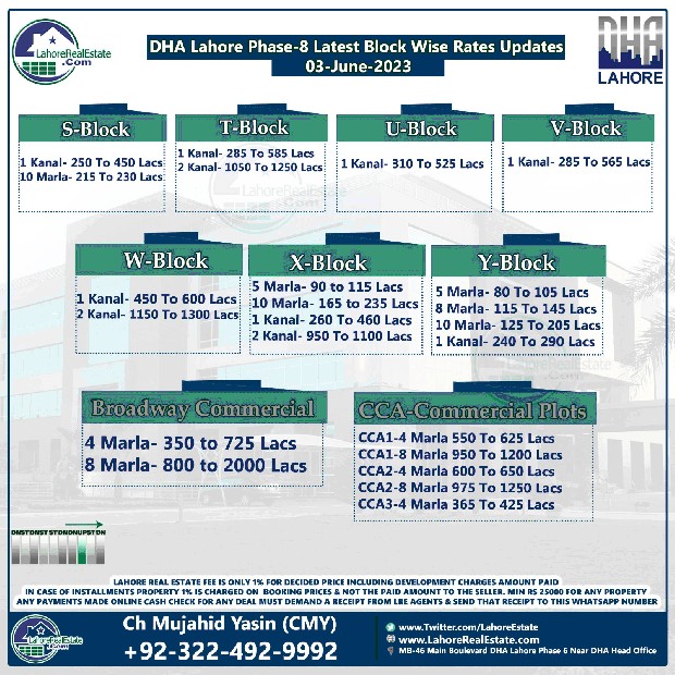 DHA Lahore Phase 8 Plot Prices Blockwise Rates 05 June 2023
