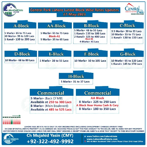 Central Park Lahore Plot Prices Blockwise Rates 29th May 2023