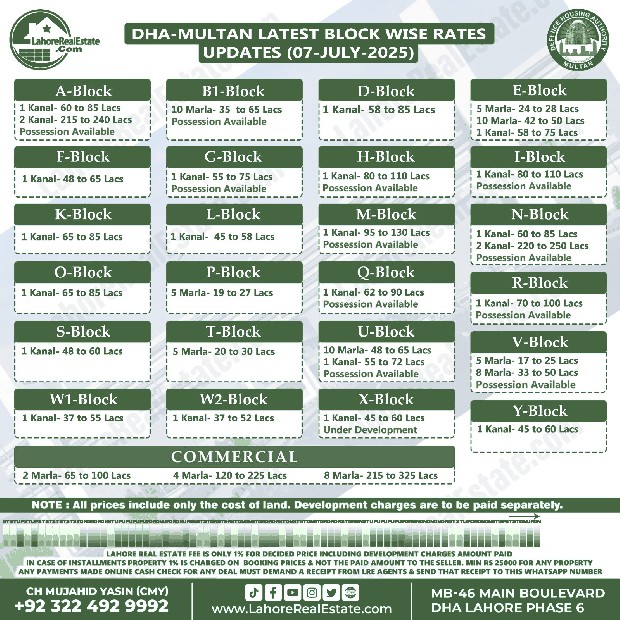 DHA Multan Plot Prices Blockwise Rates April July 09, 2025