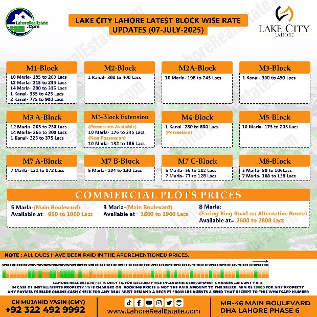 Lake City Lahore Plot Prices Blockwise Rates July 09, 2025