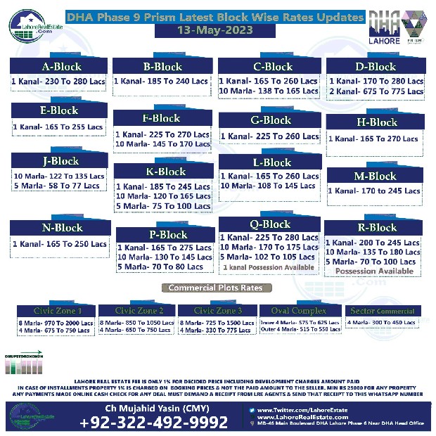 DHA Lahore Phase 9 Prism Plot Prices Blockwise Rates 17th May 2023