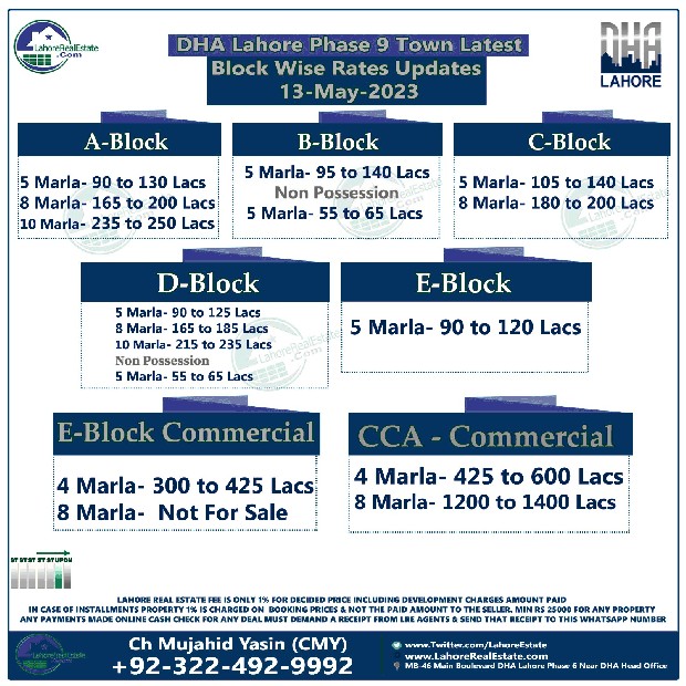 DHA Lahore Phase 9 Town Plot Prices Blockwise Rates 17th May 2023