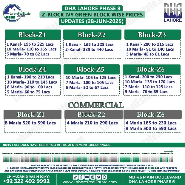 DHA Lahore Phase 8 Plot Prices Blockwise Rates June 30, 2025