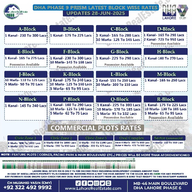 DHA Lahore Phase 9 Prism Plot Prices Blockwise Rates June 30, 2025