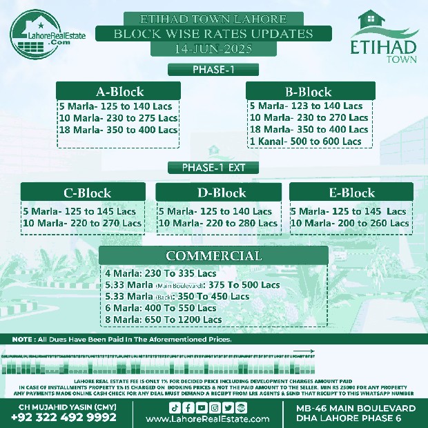Etihad Town Lahore Plot Prices Blockwise Rates June 16, 2025